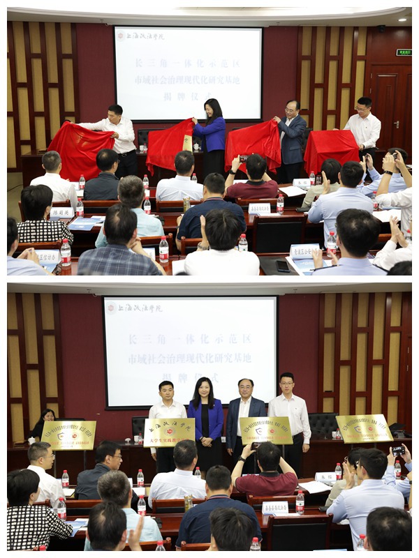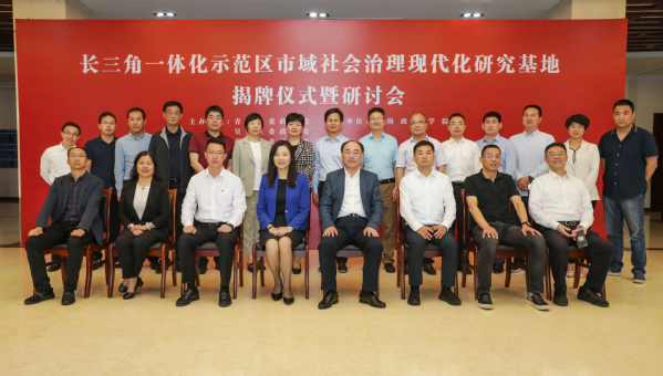 签订协议后,刘晓红、赵明、李文斌、张锡锋共同为“长三角一体化示范区市域社会治理现代化研究基地”揭牌。
