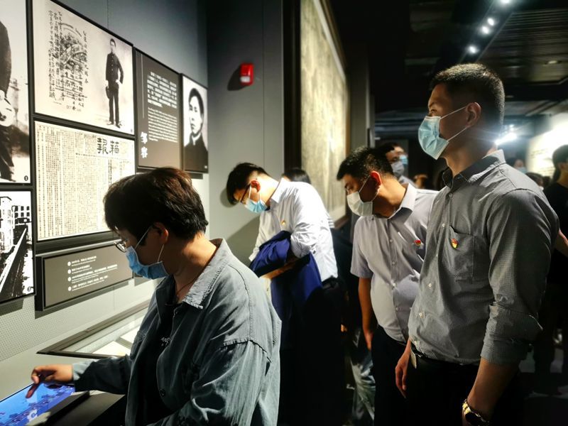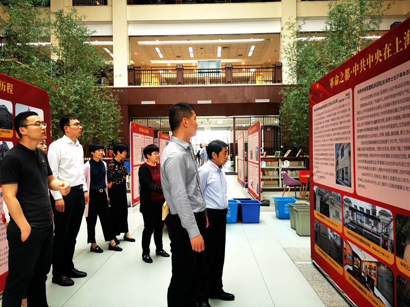 返回校园后,师生参观了图书馆展出的上海红色文化遗产图片展,通过学习“创建之路”“初心之地”“革命之都”等主题内容,共同回顾了中国共产党的百年奋斗征程。