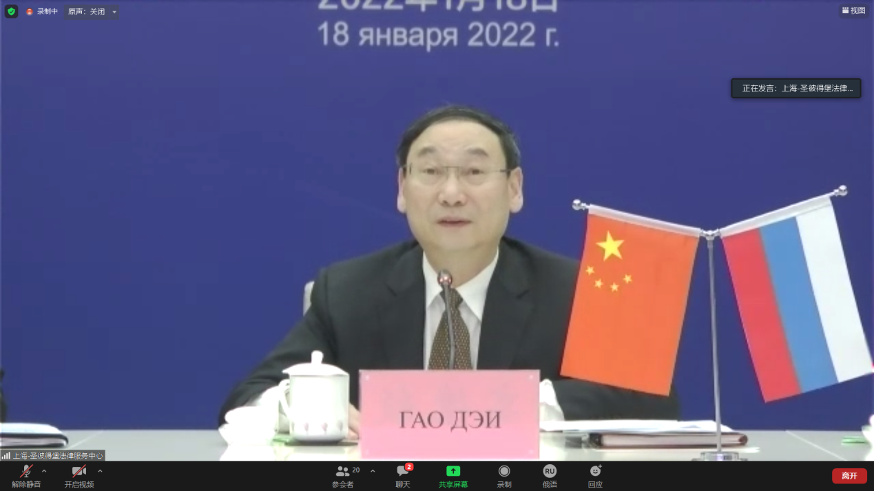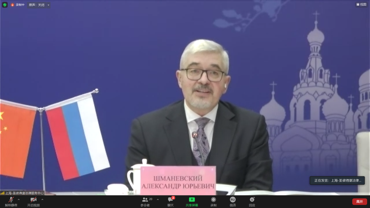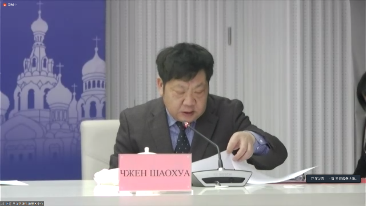 北京仲裁委员会/北京国际仲裁中心副秘书长陈福勇、中俄机电商会秘书长盛国飞、北京信达立律师事务所周广俊律师、中国福利会儿童艺术剧院院长蔡金萍、上海博物馆展览部副主任褚馨、列宁格勒州律师协会主席扎哈罗夫、圣彼得堡工商会副主席列别杰娃、圣彼得堡律师协会副主席谢缅尼亚科进行了交流发言。上海市人大外事委员会办公室主任罗晓斌、副主任罗杰、民盟市委组织部处长吕婷、俄罗斯驻上海总领事馆副领事萨姆丹恰普、商务处高级专家列季诺夫上海走出去服务中心、上海市对外投资促进中心、贸邦检测认证集团、卓力电器集团等机构和企业负责人在线参加了会议。