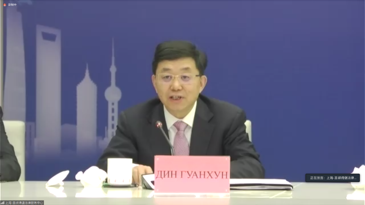 高德毅介绍了上海-圣彼得堡法律服务中心成立的背景,以及会议主办方和承办方的会前沟通情况,通报了设立上海-圣彼得堡法律服务中心的想法得到中俄两国外交部等部委的支持。各方一致认为,上海和圣彼得堡分别是中俄两国经济文化中心城市,加强两市合作意义重大,中心建成后将为两市的全面合作提供法律支持,使项目合作依法合规、互利共赢,在共赢的基础上再继续深入合作,并且把这种成功的合作模式复制推广到更多的城市,带动长三角的对俄合作,服务中俄合作大局。