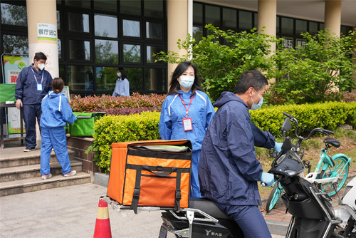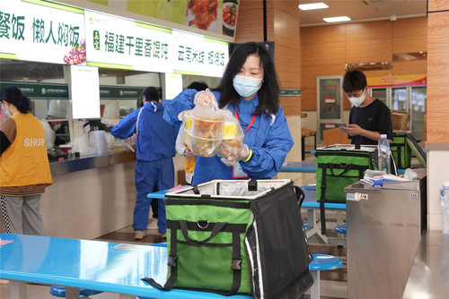 根据疫情防控形势的要求,学校不断充实服务保障力量,建立了教职工、保卫人员、退伍学生、志愿者、宿管员、楼层长为主体的分餐、送餐队伍,实现线上订餐与线下送餐无缝衔接。教职工、保安队伍、退伍学生轮流排班,化身“外卖骑手”,负责保温箱搬运以及配送到楼的工作,解决运输问题。宿管员、楼层长相互配合,负责通知点餐学生下楼自取,解决取餐问题。各支队伍相互提醒、协同配合,保证了配送的精准高效。