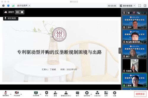论坛第二单元为“经济法热点问题研讨”,由我校上海司法研究所副所长丁茂中教授主持,7位博士进行了主题发言,6位博士参与与谈。华东政法大学丁瑶博士从数据跨域流通出发,论述了影响流动的行政壁垒生成逻辑与破解路径;上海交通大学方翔博士从解读并购法律政策为切入点,分析了数字平台扼杀式并购的反垄断法关注与法律应对;北京大学潘宁博士以“反垄断罚款裁量与鼓励创新”为题,综合运用法经济学研究方法,提出反垄断执法实践中存在“误伤”企业创新的可能,应“点到为止”;中国人民大学丁庭威博士则分析了专利驱动型并购的反垄断规制困境与出路;武汉大学王帅博士以超级平台为研究对象,分析了其作为必需设施的反垄断准入治理;复旦大学程飞鸿博士、湘潭大学黎梦兵博士分享了环境法学本土化与环境法法典化的相关研究。在与谈环节,上海财经大学刘洁、西安交通大学马文华、重庆大学关佳、中国政法大学葛枫、湘潭大学朱蕾、厦门大学湘崔虹六位博士,对上述发言分别进行了深度评析。