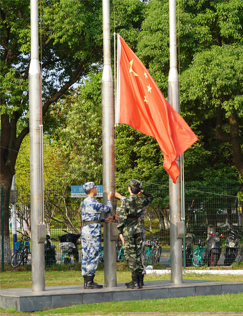 伴随着清晨的朝霞,由我校退伍士兵组成的“军魂团”升起了鲜艳的五星红旗,全体师生面向国旗,唱响国歌,向祖国致以崇高的敬意和深深的祝福。随后,法律学院王子泰等五位同学共同朗诵《祖国颂》,用铿锵有力的青春之音,歌颂祖国的繁荣昌盛。牟雨衡等九位同学带领全体师生合唱《我和我的祖国》,用歌声诉说对祖国的拳拳赤子心。