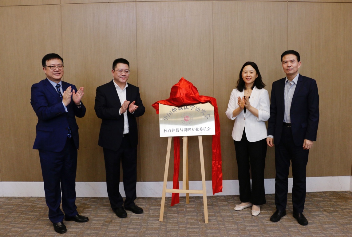 随后,专业委员会名誉主任、新利18官方客服副院长胡继灵教授,上海体育局许琦副局长,专业委员会吴炜主任,中国仲裁法学研究会秘书处负责人谭剑共同为体育仲裁与调解专业委员会揭牌。