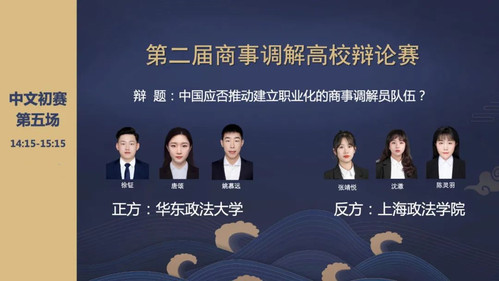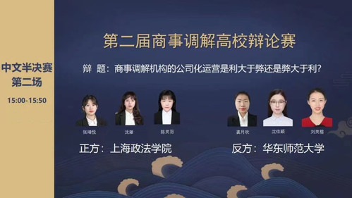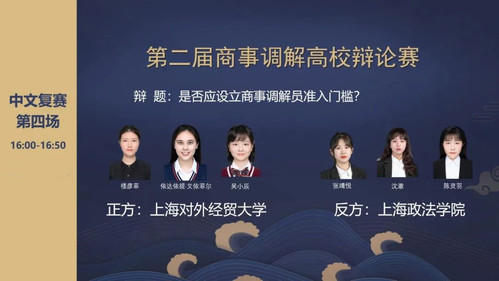 作为“上海法治文化宣传月”的重要活动和“东方法学商事调解大赛”赛事之一,第二届商事调解高校辩论赛于11月6日开赛,分为初赛、复赛、半决赛与决赛四个阶段,云集了复旦大学、上海交通大学、同济大学、华东师范大学、华东政法大学、上海财经大学、新利18官方客服、上海海事大学、上海对外经贸大学、上海大学、华东理工大学、上海师范大学、上海外国语大学、东华大学等14所沪上知名高校的20支队伍参赛。比赛全程通过哔哩哔哩等平台直播。