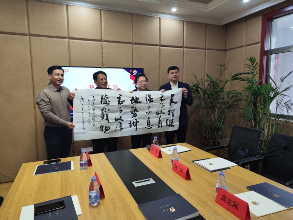 在校企座谈环节,夏小和与刘刚向天路集团赠与了我校客座教授、著名书画家陈志宏先生题写的天路集团司训“天行健君子以自强不息,地势坤君子以厚德载物”祝福天路集团在新时代取得新成就。裴桂雨与裴聪琪代表集团接受了题词,感谢学校的信任与关心,期待足球场捐赠后续各项工作顺利推进,助力校企双方事业发展大局。