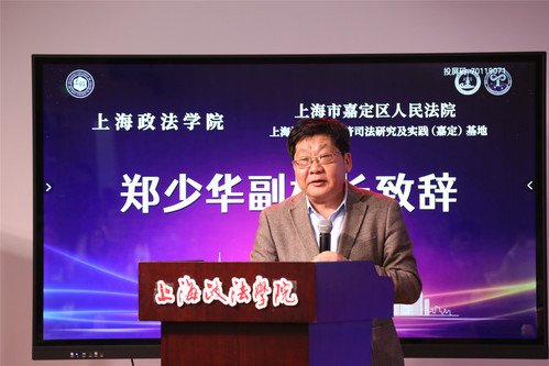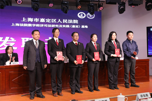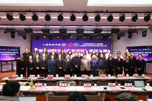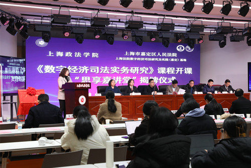 嘉定区人民法院政治部主任杨鹰飞、刑事审判庭副庭长徐怡南、嘉北人民法庭副庭长纪学鹏、商事审判庭副庭长周莉、民事审判庭副庭长张晓莉、审判监督庭庭长潘静、办公室主任顾玉春、政治部副主任郑帅、政治部副主任金煜等一行13人,新利18官方客服国际法学院党总支书记王守芬、上海司法研究所常务副所长丁茂中、研究生处挂职副处长孙放以及200余位师生参加开课和揭牌仪式,共同见证三单位协同培养数字经济高端人才的重要时刻。