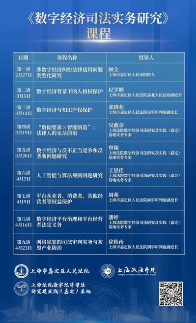 该课程依托上海法院数字经济司法研究及实践(嘉定)基地“理论+产业+司法”智库联合体,不仅有嘉定区人民法院在数字经济领域的专业审判人才,还集聚了头部互联网平台企业、互联网转型生态企业的基地实务专家。