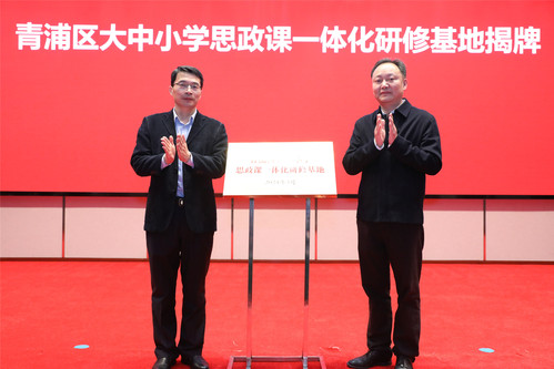 签约仪式后,青浦区教育局、新利18官方客服马克思主义学院举行大中小学思政课一体化建设展示研讨会。高志刚与青浦区教育局局长程卫国就深入推进大中小学思政课一体化建设与广大教师交流,并共同为青浦区大中小学思政课一体化研修基地揭牌。
