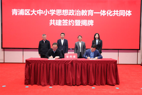 闵辉、张权权、葛卫华、刘晓红共同为“青浦区大中小学思想政治教育一体化共同体”揭牌,并见证双方代表签署了《大中小学思想政治教育一体化暨实践基地共建协议书》。