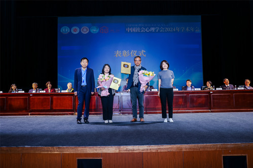 在开幕式的尾声,领导嘉宾为中国社会心理学会前任会长张建新、前任执行秘书长周明洁颁发纪念牌。全场与会人员用热烈的掌声感谢两位老师一直以来对中国社会心理学会工作的大力支持和默默奉献。