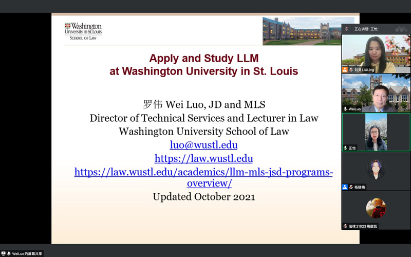 In the evening of October 21, 2021, a webinar on LLM program at Washington University in St. Louis was successfully carried out online. LUO Wei, Professor of School of Law at Washington University in St. Louis (WUSTL), and ZHANG Zhengyi, Deputy Director of the Department of International Cooperation and Exchange, attended the information session. The session was hosted by LIU Ling, Student Program Coordinator in International Affairs Office of SHUPL.