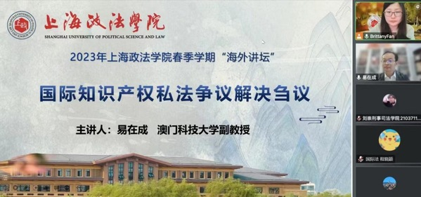 On June 1, the overseas lecture--“Opinions on Dispute Resolution of International Private Intellectual Property Law” was held online. The lecture was delivered by Yi Zaicheng, associate professor of Macao University of Science and Technology. Fan Ruijuan, Coordinator of Business Trip,presided over the lecture. The students of SHUPL actively participated in the lecture.