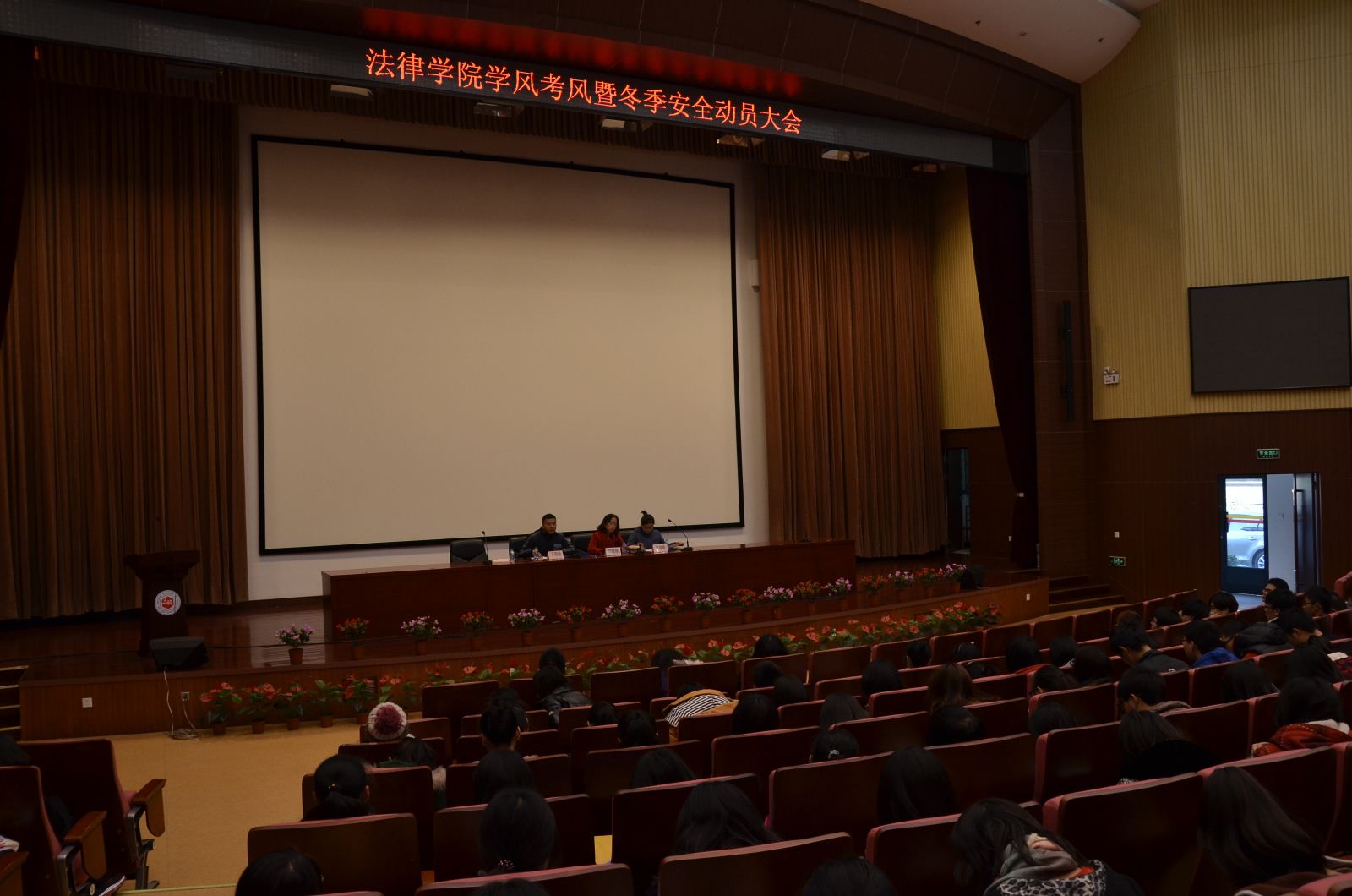 12月10日下午,法律学院在天马讲堂召开学风考风暨冬季安全动员大会。出席本次大会的有法律学院院长助理闯晓燕、法律学院辅导员丁明强和杨超雄。大一全体学生参加了本次大会。大会由丁明强主持。