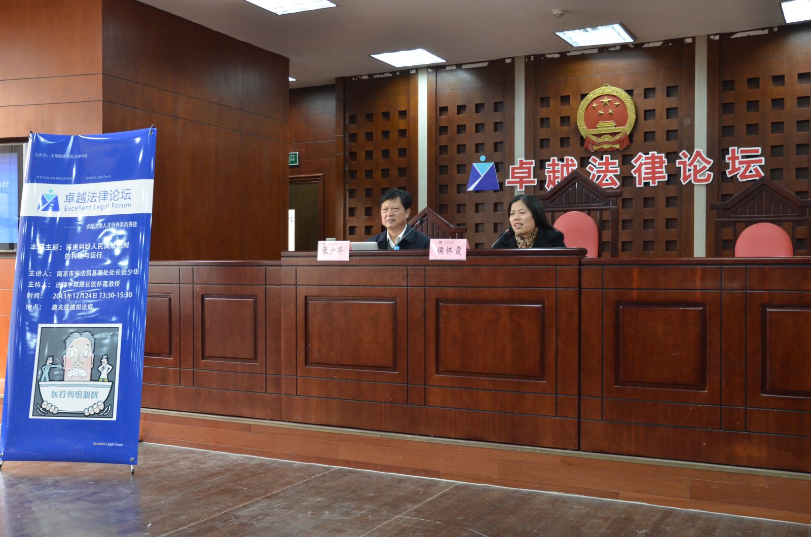 12月24日下午,南京市司法局基层处处长张少华做客法律学院“卓越法律论坛”,主讲了“医患纠纷人民调解机制的构建与运行”,此次讲座在庸夫楼模拟法庭举行。法律学院党总支书记沈国勤以及部分研究生和本科学生参加此次讲座,本次讲座由法律学院院长侯怀霞教授主持,诉讼法教研室任学强副教授进行点评。
