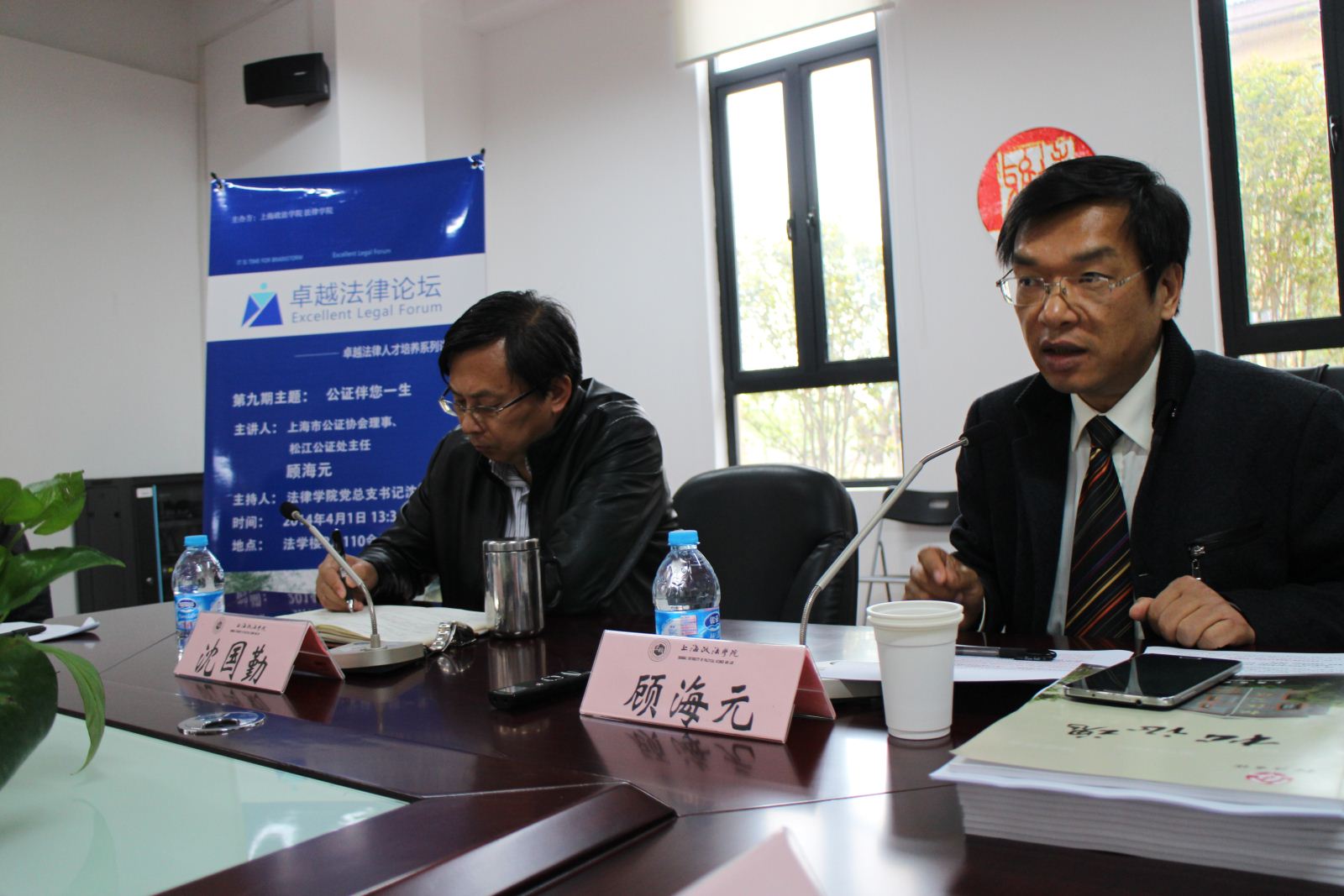 4月1日,法律学院在法学楼B2-110会议室,举办了第九期“卓越法律论坛”,本期讲座邀请了上海市松江公证处主任顾海元,主讲“公证伴您一生”,卓越班学生和“公信奖学金”获得者参加此次讲座,讲座由法律学院党总支书记沈国勤主持。
