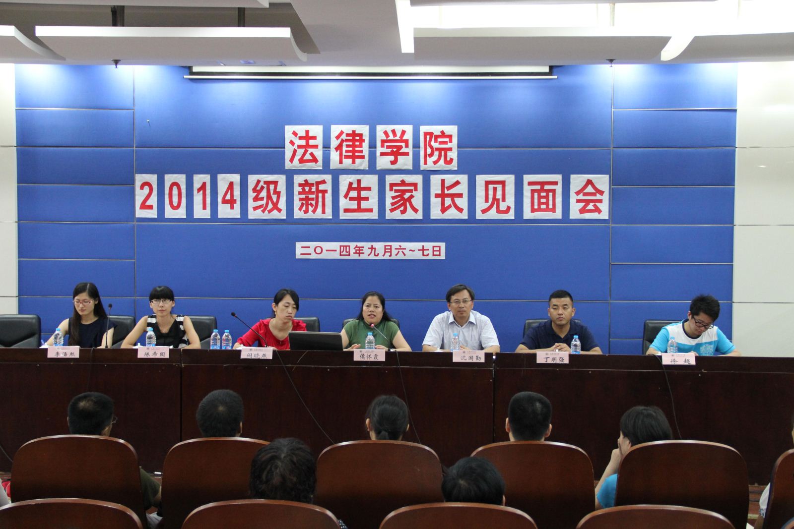 2014年9月6日、7日下午14:30,法律学院2014级新生家长会于庸夫楼112会议室、101会议室召开。法律学院院长侯怀霞教授、法律学院党总支书记沈国勤、法律学院新生辅导员全体新生家长出席了此次会议,会议由法律学院院长助理闯晓燕老师主持。