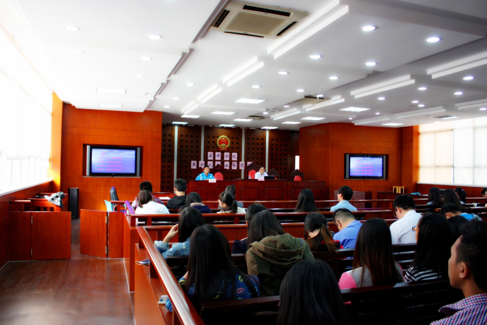 2014年10月28日下午14:00,法律学院第十九期党校第二讲在庸夫楼模拟法庭举行。后勤保障中心主任助理潘高荣、法律学院学生党支部书记丁明强以及71名法律学院入党积极分子参加了本次党校课程。