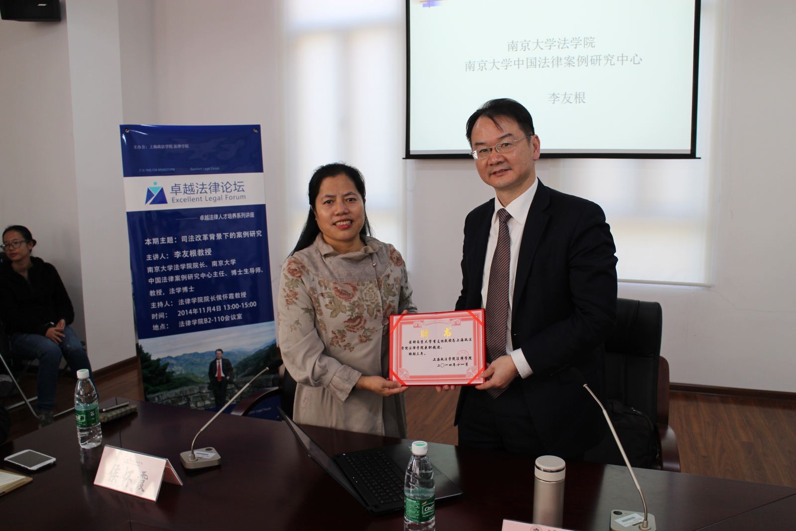 讲座开始前,侯怀霞教授为李友根教授颁发“新利18官方客服法律学院兼职教授”聘书。