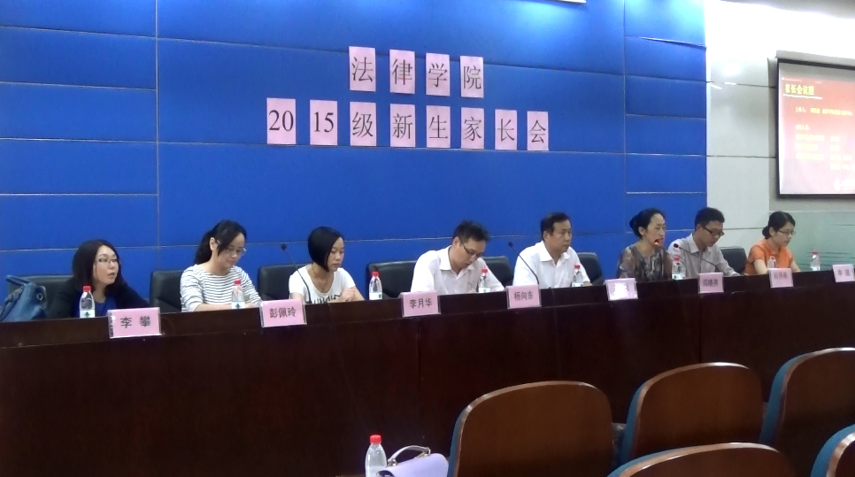 2015年9月5日下午两点半,新生入学报道正在进行中,法律学院2015级上海籍新生家长会在庸夫楼112如期举行。法律学院党总支书记文立月、副院长杨向东、党总支副书记闯晓燕,新生辅导员肖诗来、李月华、彭佩玲、申迪、李攀及部分新生家长出席会议。本次大会由闯晓燕老师主持。