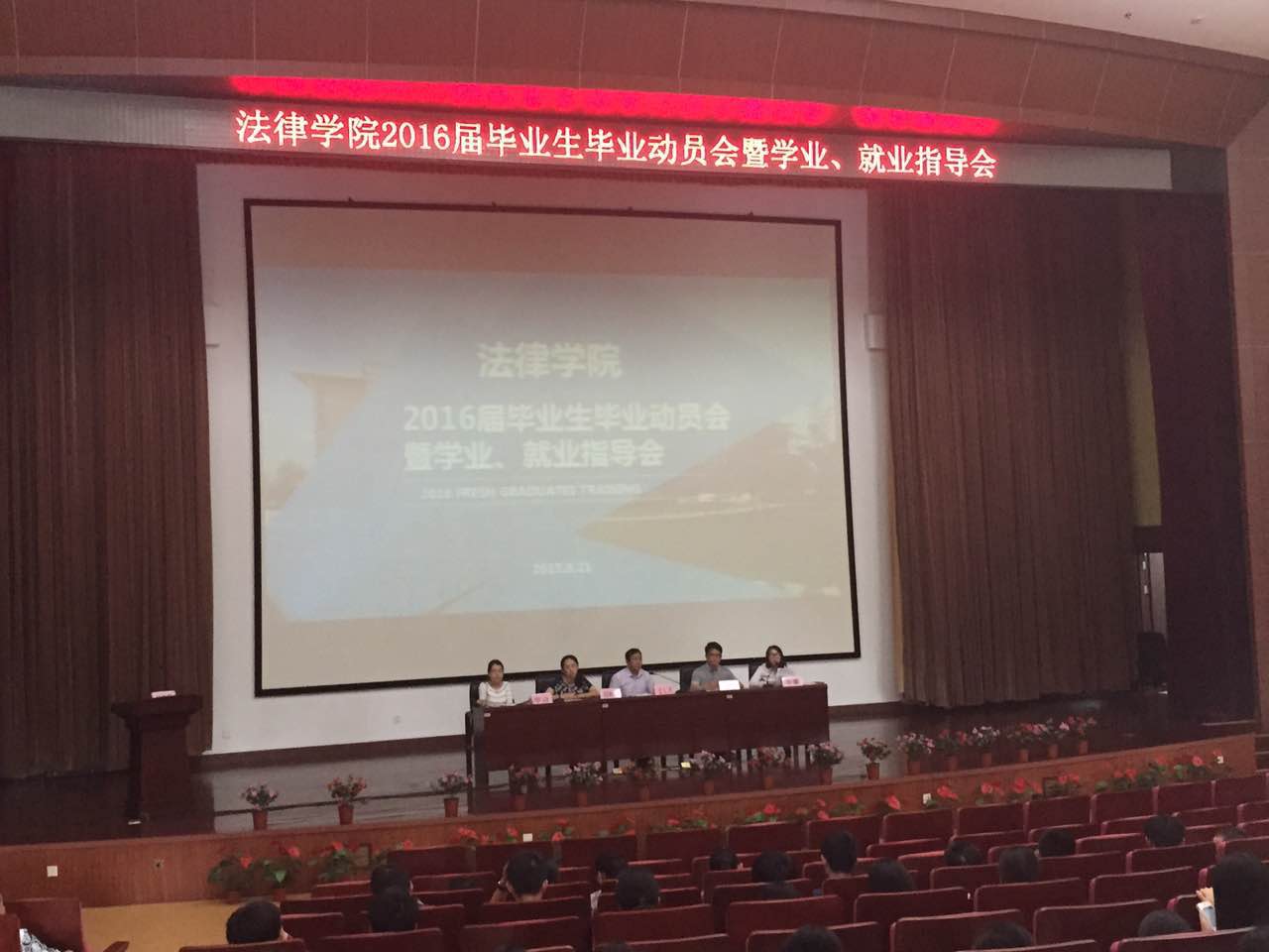9月21日上午9:00,法律学院召开2016届毕业生学业、就业指导会。法律学院党总支书记文立月、党总支副书记闯晓燕、全体毕业班辅导员、优秀校友何晓攀以及全体毕业生参加会议。