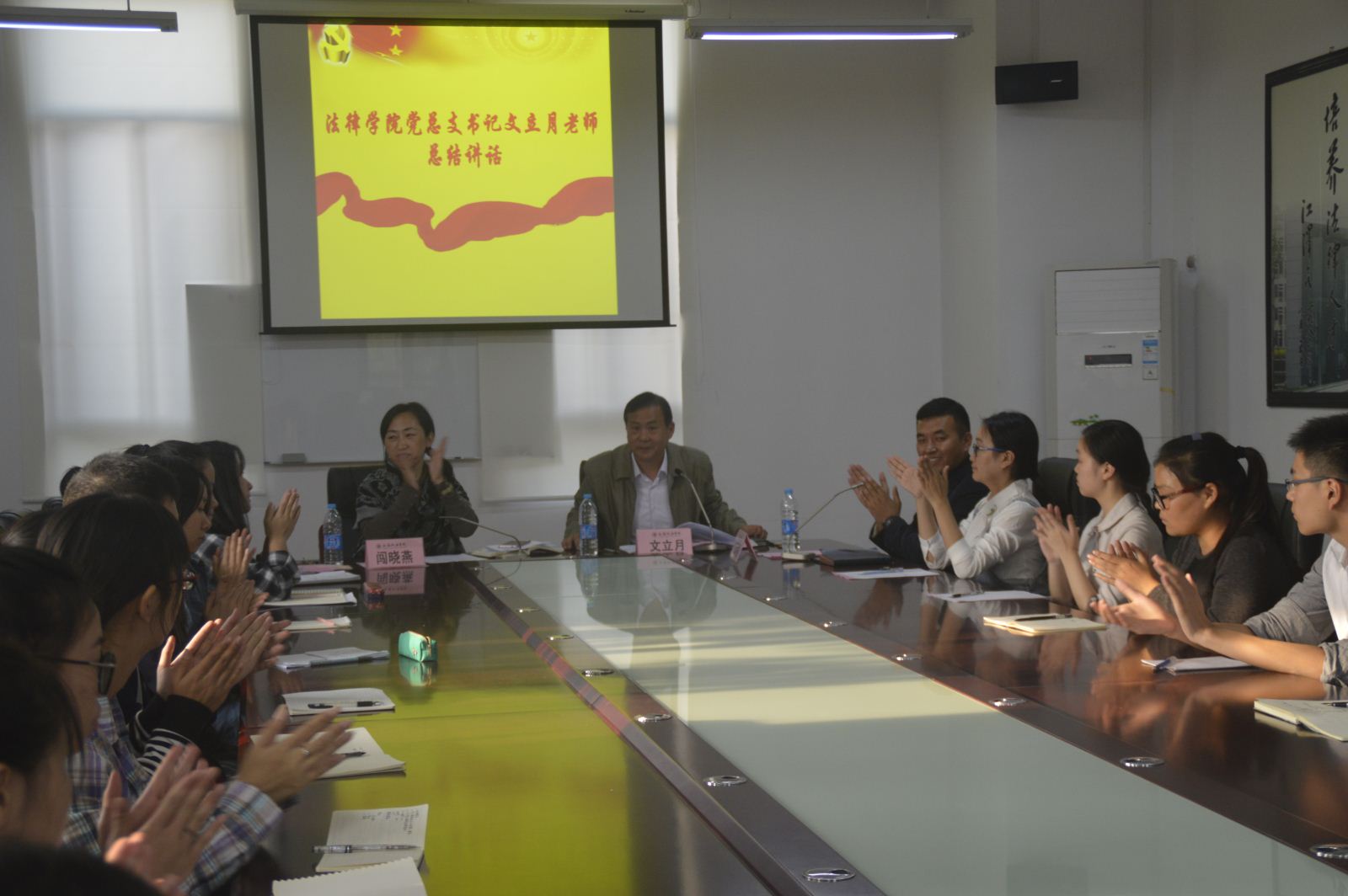 最后,由文立月书记进行了总结讲话,并为业余党校入党积极分子讲授了第一课。他指出,一是要端正入党动机,努力在思想上过“三关”,即态度关、认识关、言行关;二是积极践行大学生要求,努力把握入党积极分子的“四个标准”,即政治思想、学习成绩、日常表现和群众认可;三是以实际行动从“三个方面”入手,即加强理论学习,不断提高思想境界,注重理论联系实际,严格用党员标准要求自己,强化党性锻炼,积极参加各种组织活动,努力做一名优秀的入党积极分子。文书记引用大量生动的典故给学员们带来了精彩而丰富的“心灵鸡汤”,为业余党校的入党积极分子带来了精神与心灵的洗礼。(王颖撰稿/郑晖宏摄影)