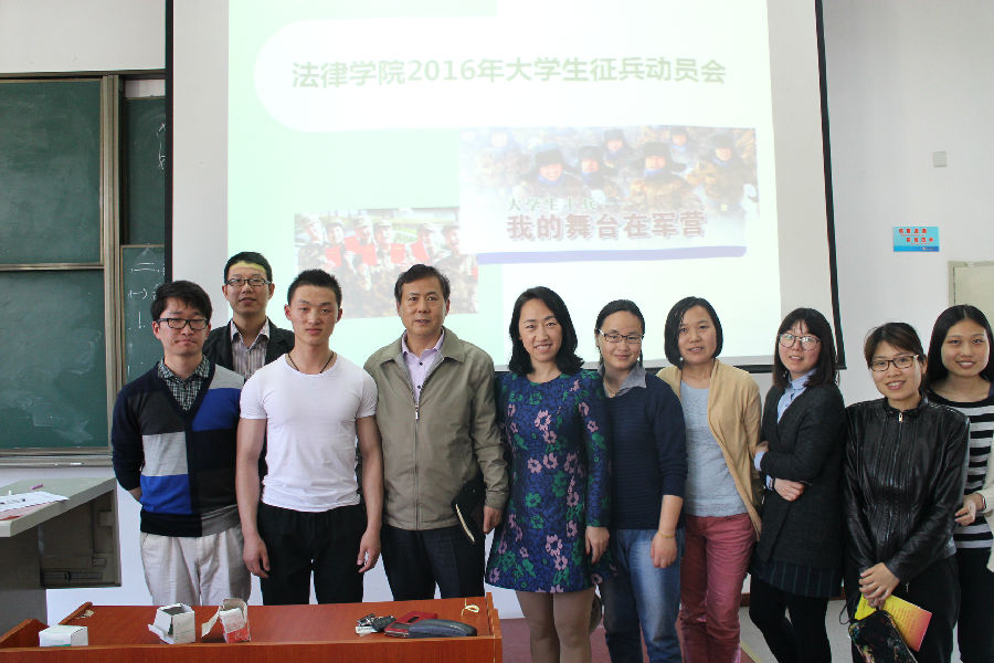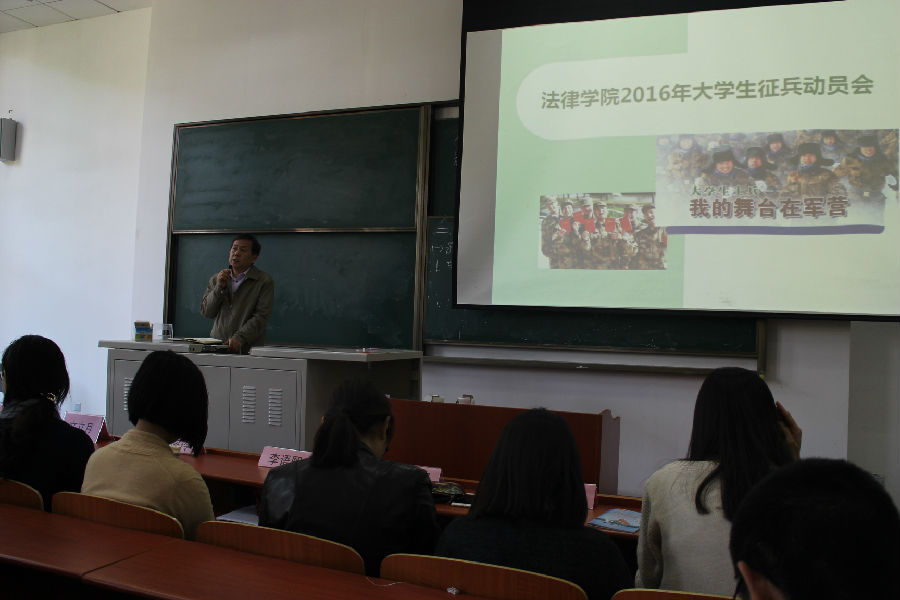 2016年5月3日,法律学院在法学楼B4-105召开大学生征兵动员会,参加大会的有法律学院党总支书记文立月、副书记闯晓燕、全体辅导员和学院全体男生,会议由辅导员徐超老师主持。