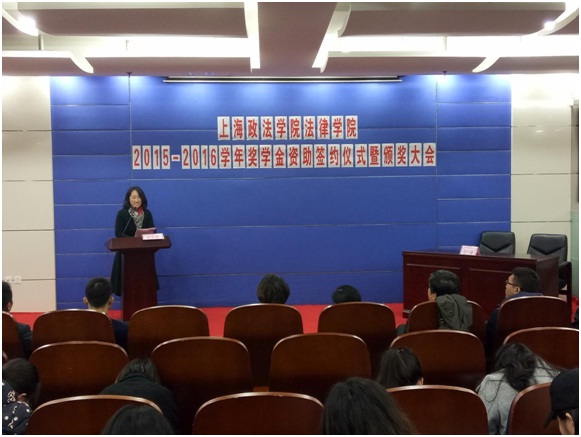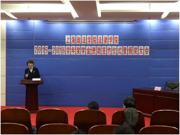 各资助单位代表分别发言。首先,范仲兴主任发言。虽然已经61岁,但还是依旧奋斗在工作岗位,他上台为大家展示了31年前的结业证书,感谢上政对他的培养。还向大家分享了他做慈善以来的感人故事,希望通过设立奖学金来鼓励大家勤学苦练,向陈涛学长学习,回报母校和社会。接下来,孟山副主任通过“想、学、做”这三个字来鼓励同学们勇于进取,做一个对社会有贡献的杰出人才。夏海波和杨敬石则为同学们介绍了各自的事务所,对我校学生给予肯定与好评并寄予厚望。接下来是两位毕业学长武晨和陈涛发言。武晨学长心系母校,因为对兼职深有感触,就想通过研究课题创新来为同学们提供兼职和补贴,坚持爱心理念。陈涛学长则分享了自己的故事,三年前拿到“范仲兴”奖学金时就在想,自己能不能也设立奖学金来回报母校,让爱心传递下去。在拼搏奋斗之后,他用自己的努力证明了一切,他拿出了资金为优秀学生提供鼓励和支持,希望同学们能够重视英语,提高英语水平。之后,法律学院院长侯怀霞讲话,要求同学们广读书、勤思考、多动手,锻炼口才,继续努力,不忘爱心人士,回馈社会。最后,校党委副书记、副校长周银娥进行总结讲话,对获奖同学表示祝贺,感谢各方对我校的大力资助,她表示希望同学们在学业上追求卓越,继续保持学习的拼劲,并向爱心人士学习,随手公益、学会公益,传递爱心,让感恩的力量一直传递下去。