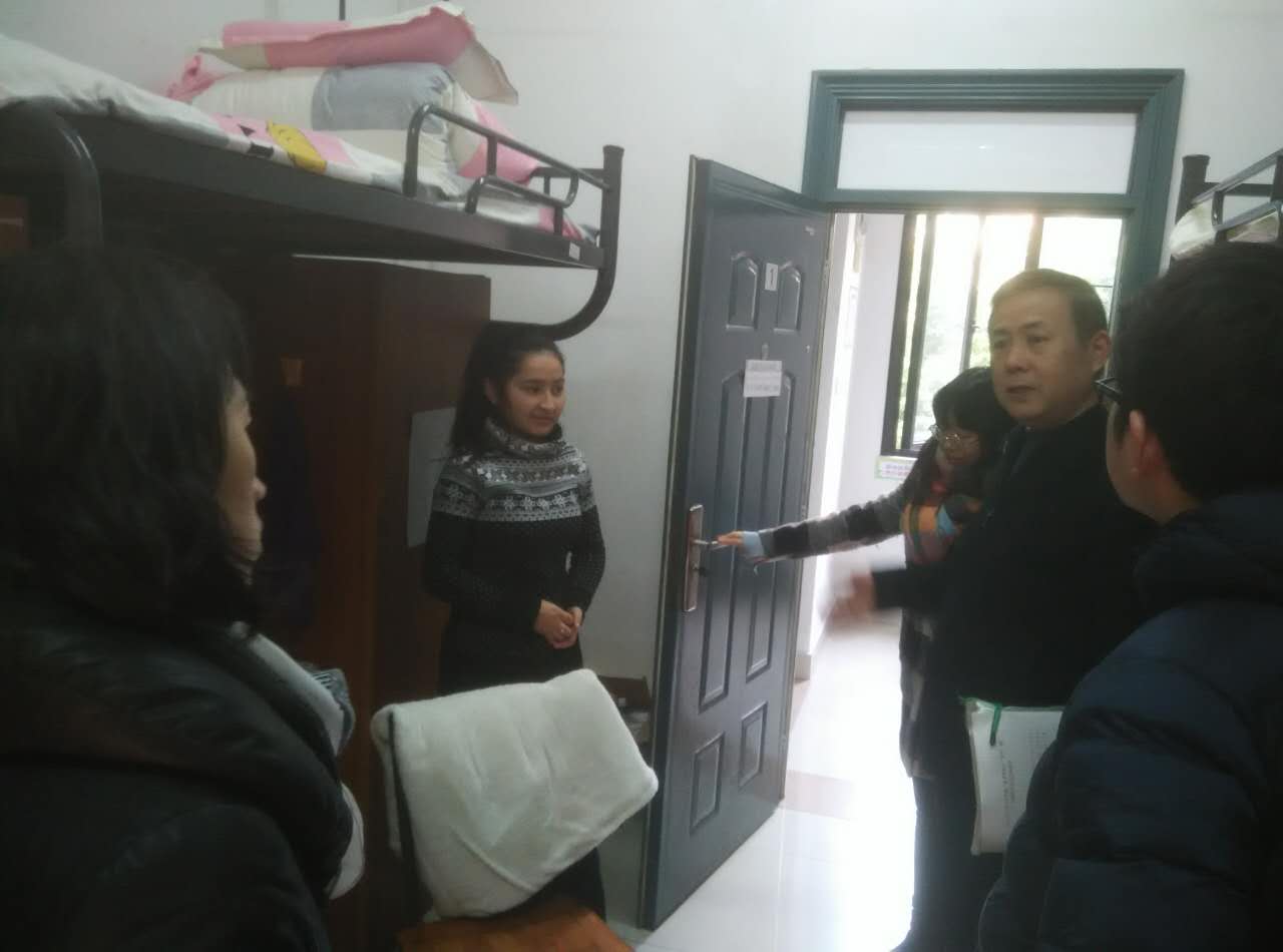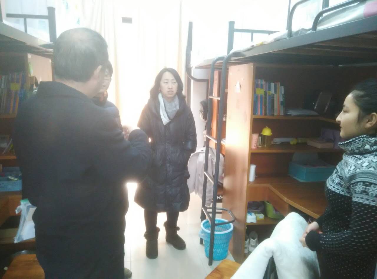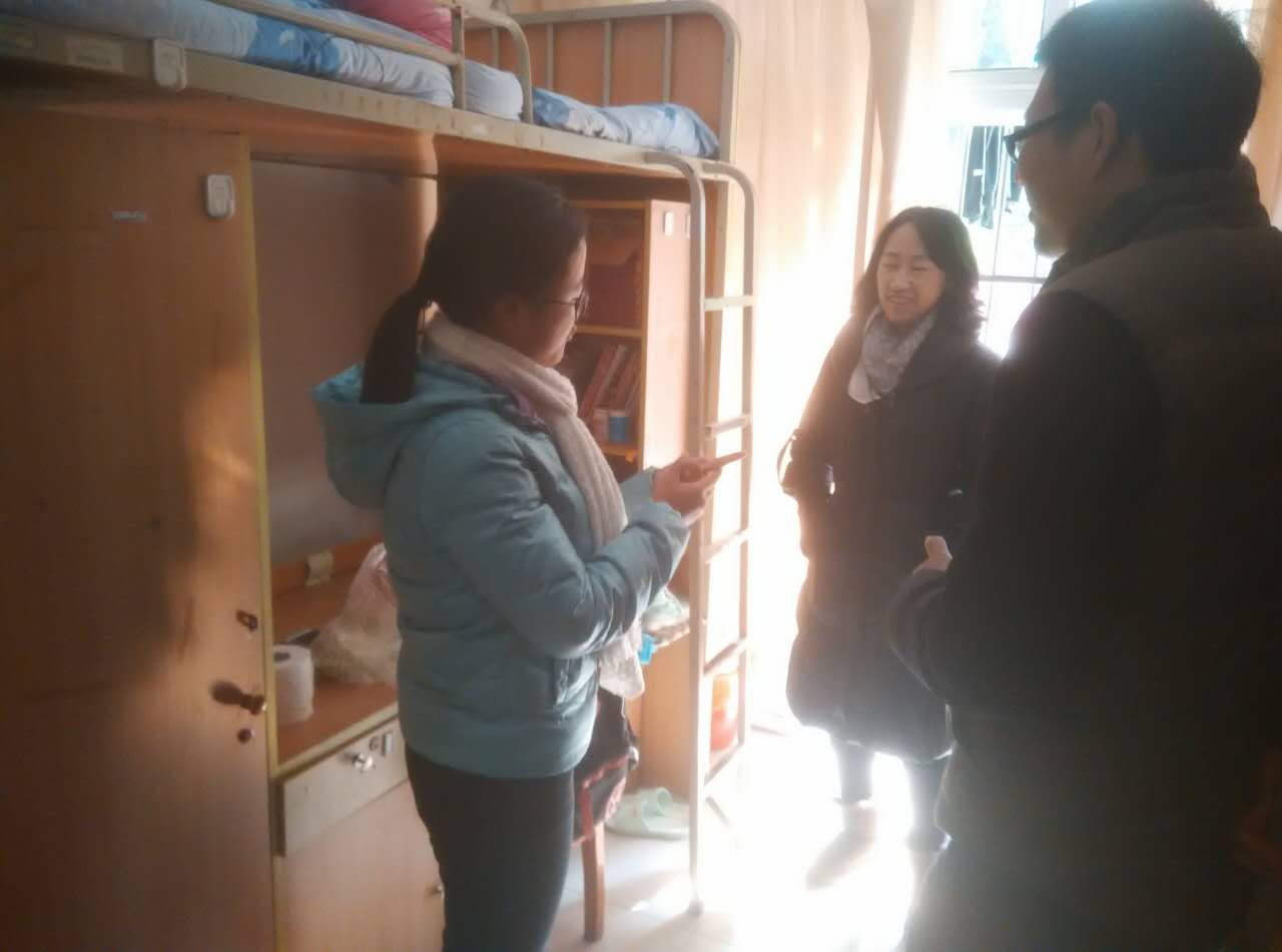领导和老师们一起走进每一名困难生的寝室,和他们亲切的交流。这四名同学都是大一新生,初入大学,有同学还是比较害羞,不善言语,学院领导耐心开导,给他们提供一些切实可行的方法来锻炼提高自己。领导和老师们和他们聊生活,学习,家庭状况,了解他们遇到的困难,积极协调学校和学院相关部门,为他们及时解决学习之外的后顾之忧。同时寒假将至,询问他们是否买好了回家的车票,是否有人同行,下车了是否有人接,保证每一个环节的安全,学生能够顺利回家和家人过一个快乐的春节。