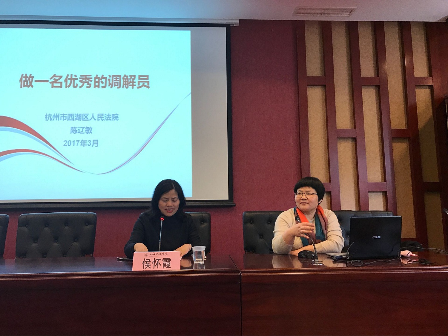 3月21日下午,法律学院在校部楼107举办了以"做一名优秀的调解员"为主题的卓越法律论坛。本次论坛我们有幸邀请到了杭州市西湖区人民法院副院长陈辽敏。法律学院院长侯怀霞教授出席并主持本次论坛,2016级卓越法律人才试点班和人民调解班全体学生参加。