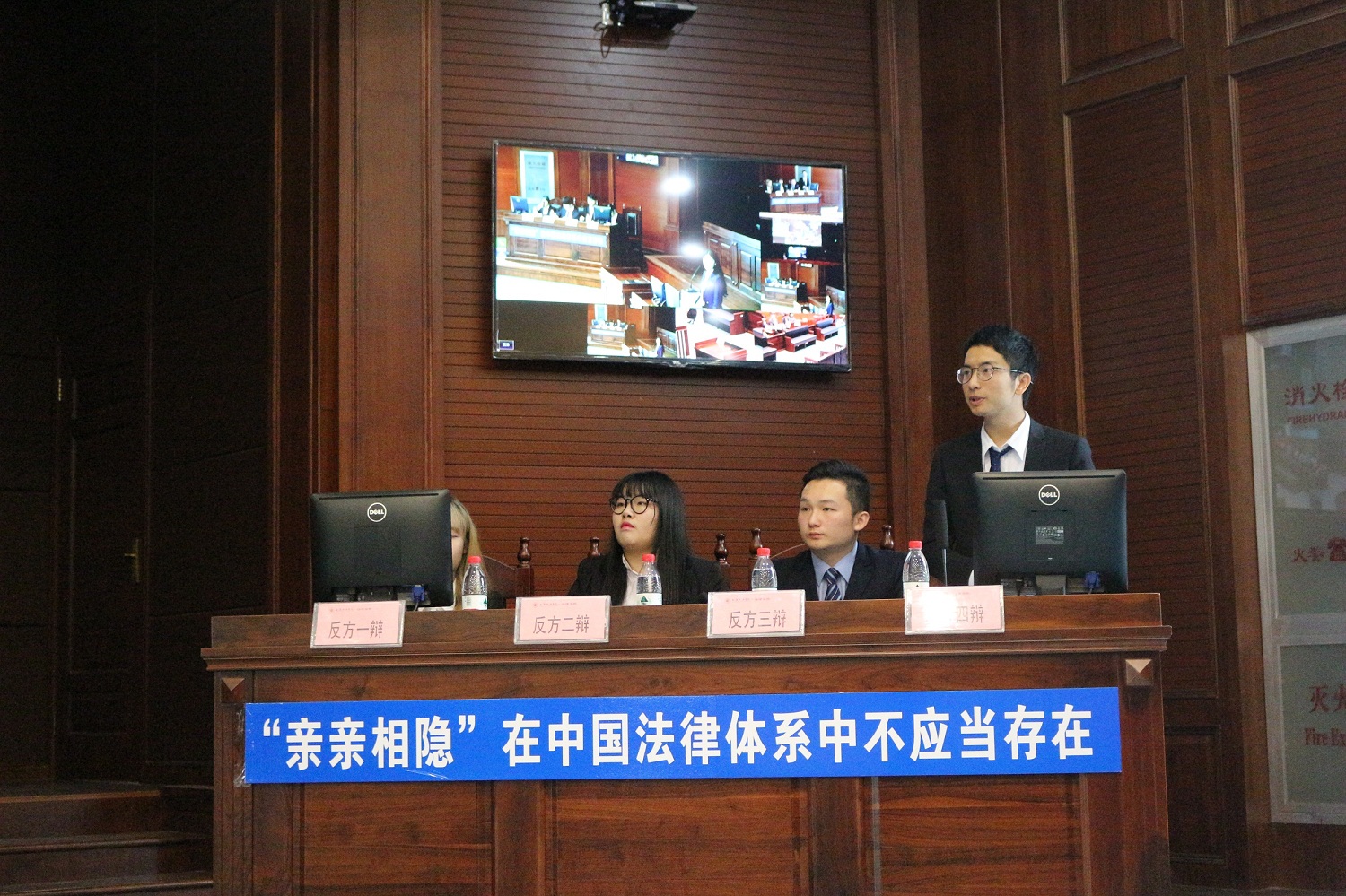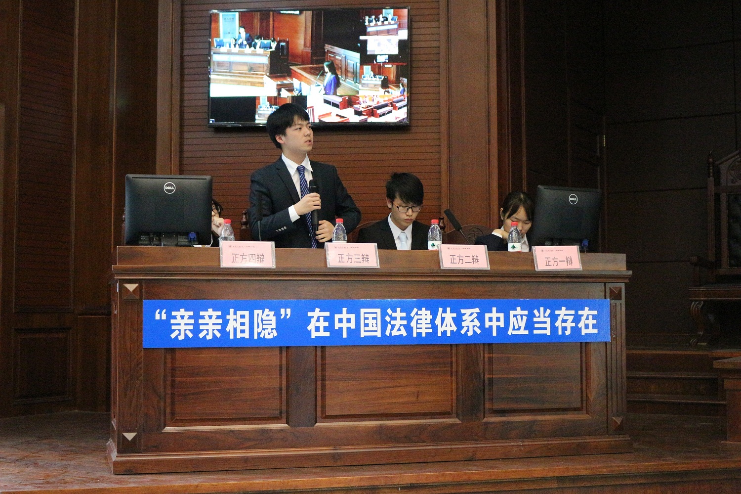首先由闯晓燕老师介绍卓越法律人辩论大赛的背景、发展以及意义。闯老师强调了辩论赛彰显的是辩证思维以及专业化的缜密逻辑,体现的是辩手们的论辩能力,阐明了辩论技能和公平正义精神对法律人的重要意义。紧接着,辩论大赛决赛正式拉开帷幕。双方辩论队就“‘亲亲相隐’在中国法律体系中是否应当存在”展开辩论,于“唇枪舌战”中慷慨陈词,你来我往,竭力表达自己的观点并寻找对方的漏洞,各队的辩手们在针锋相对中一展辩论风度,侃侃而谈。正反方辩手清晰的思路给观众留下了深刻印象,现场气氛不断升温。