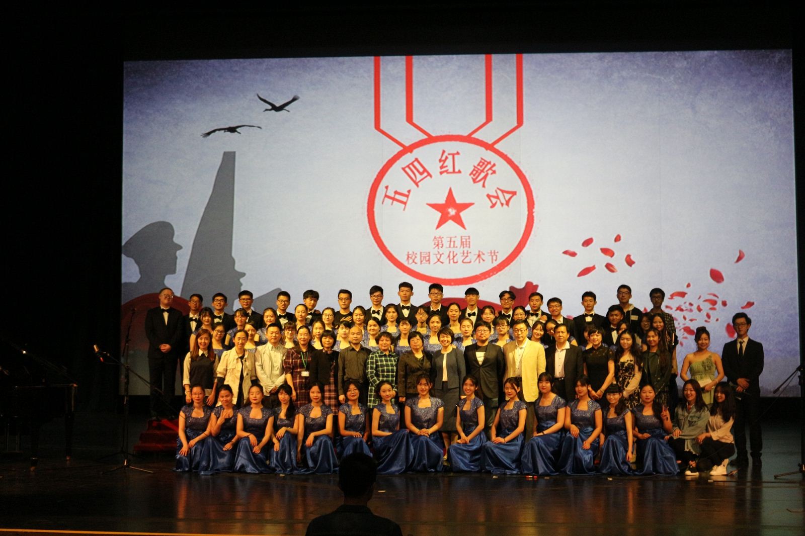 法律学院合唱队以《军港之夜》为比赛曲目,表达了对海兵的高度赞美和敬佩之情。合唱队经过一个月的刻苦训练,队员之间产生了默契,演唱水平得到了提升,对合唱比赛充满热情。比赛当天,女生身着象征海洋的蓝色长裙礼服,男生则身着黑色礼服。在演唱过程中,队员与指挥默契配合,全程面带笑容,期间加入了钢琴与小提琴的合奏,并邀请到了我院党总支书记文立月老师与团委书记助理关正华老师共同参与,获得了观众热烈的掌声。