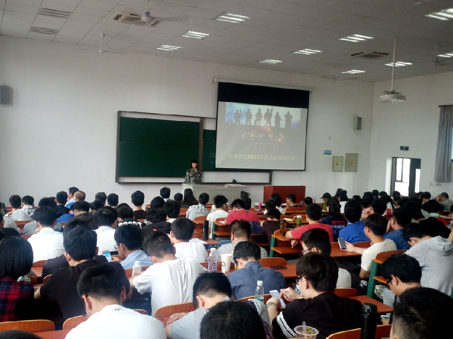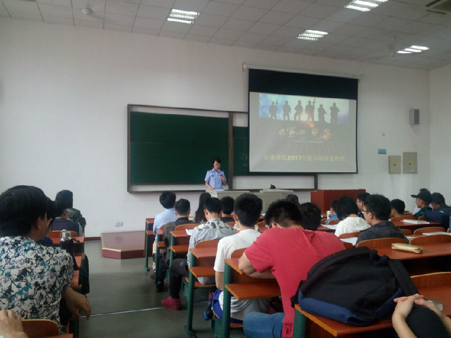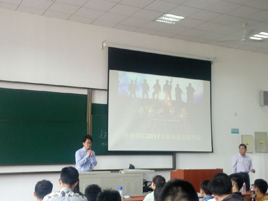 2017年5月24日中午,法律学院召开2017年征兵动员宣传会,学院党总支书记文立月,全体辅导员老师、全院男生都出席了会议。会上还特别邀请了,刑事司法学院和高职学院的退伍老兵为大家宣讲。