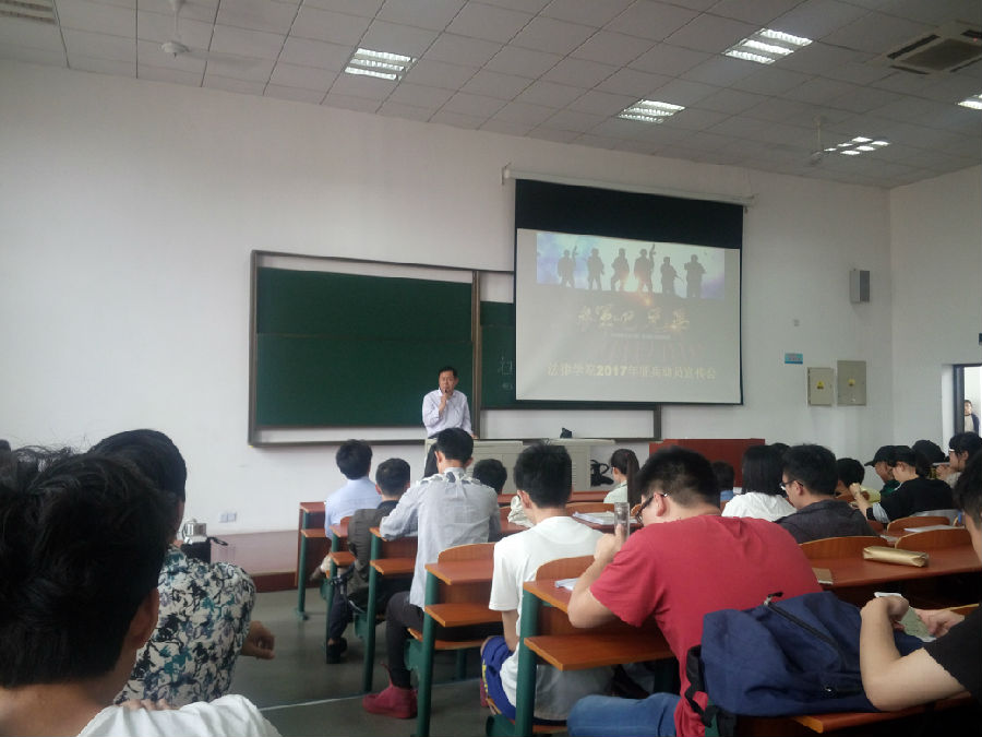 最后,文老师从征兵入伍的优惠政策等角度做了总结,鼓励大家进入军营学习,他说“部队是锻炼人、熏陶人的大熔炉,是关心人、爱护人的大家庭,是健体魄、涨知识、提素质的好地方,大学生们应趁着年轻,立志尚武志,投身军旅当中,披肝沥胆,壮我中华,当一个能文善武的热血男儿,做一名顶天立地的有为青年。”