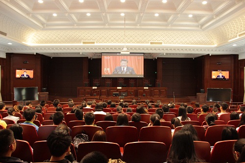 10月18日上午,中国共产党第十九次全国代表大会在京隆重召开。法律学院组织师生在B4模拟法庭收听收看了党的十九大开幕实况和习近平总书记代表党的十八届中央委员会所作的报告。学院党政班子成员、在校教师和本科生、研究生党员、入党积极分子、学生代表200余人参加集中收看。