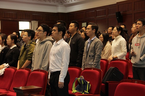 伴随大会开幕式的进行,在场收看直播的师生与大会现场同步全体起立高唱《中华人民共和国国歌》,为毛泽东、周恩来、刘少奇、朱德、邓小平、陈云等已故老一辈无产阶级革命家和革命先烈默哀。