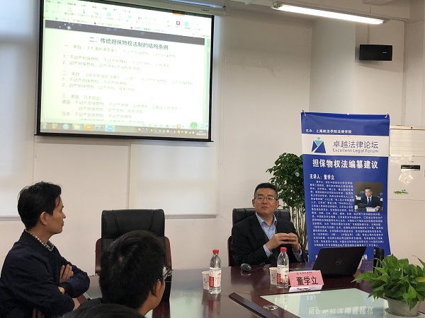 10月15日上午,法律学院在B2-110会议室举办了以“担保物权法编纂建议”为主题的卓越法律论坛,本次论坛有幸邀请到了中国海洋大学法学院繁荣工程教授、博士研究生导师董学立担任主讲人,法律学院院长侯怀霞、副院长王康教授出席本次论坛,论坛由侯怀霞教授主持,我院部分本科生、研究生参加。