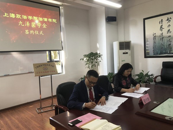 5月21日下午,新利18官方客服法律学院九泽奖学金签约仪式在法学楼B2-110顺利举行。上海市九泽律师事务所主任郑斐戈律师、法律学院院长侯怀霞教授、党总支书记文立月出席,签约仪式由学院党总支副书记徐海琨主持。