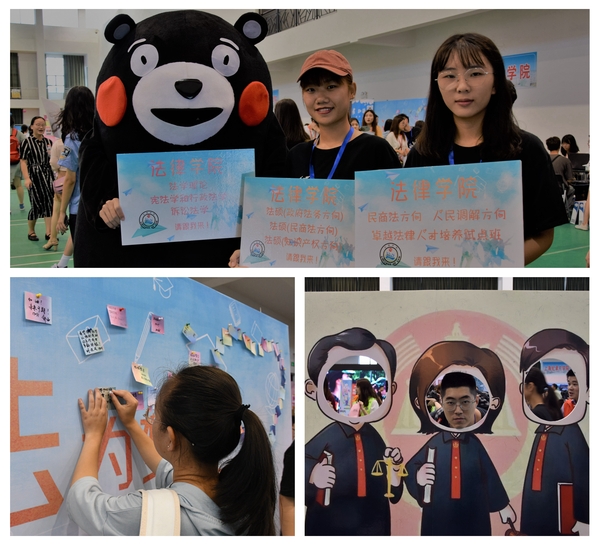 本次法律学院迎新现场主要分为本科生报到区、研究生报到区以及法律易班三个区域,在为新生报到带来便利的同时也体现了法律学院此次迎新“法律共同体”的主题。