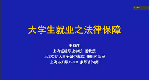 9月12日下午,法律学院在线举办第74期卓越法律论坛——“大学毕业生就业中的法律保障”,上海城建职业学院王彩萍副教授受邀作讲座。法律学院院长侯怀霞教授主持本次论坛,法律学院党总支副书记陆嵬担任与谈人,我校师生和来自校外的听众约150人在线聆听讲座。