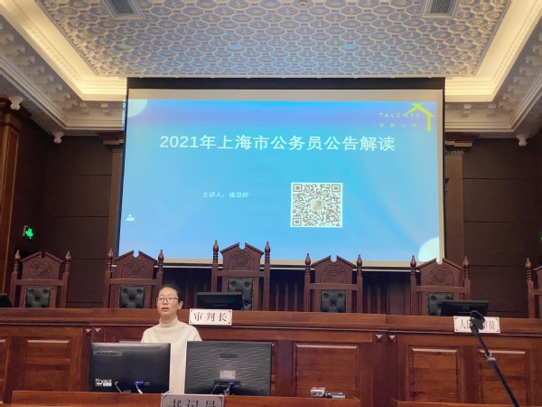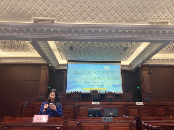 为了帮助上政公考学子顺利上岸,11月5日晚,法律学院研究生团总支创新创业部于法学楼B4模拟法庭举办了2021年上海市公务员考试专题讲座,上海求贤公考创始人潘慧婷应邀出席讲座,为大家解读最新的考试公告,提供选岗报岗策略。讲座由法律学院研究生团总支创新创业部部长罗兰主持。