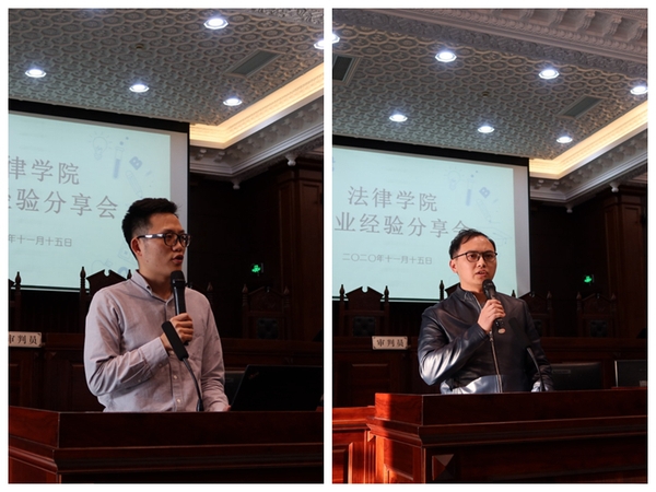 陈子豪向大家分享了求职经验。学长从查获求职信息到制作投放简历、准备面试的整个求职流程进行了全面的讲述,鼓励大家尽早地在不同的平台、行业进行实习,找到适合自己的职位。工作时做好自己手头的业务,虽然律师的工作很难,但只要坚持下去就一定会有很好的前景。袁小冬主要介绍了有关公务员考试的备考经验。他首先简要概括了上考与国考的不同点,向同学们传授笔试与面试时的经验。同时建议大家在笔试时发挥自己的优势,先做好自己擅长的题目,拿到应得的分数;面试时要注意礼仪、着装规范,回答问题时要有自信、反应迅速、精准答题、语言流畅,对考官追加的问题不要慌张,要如实回答。