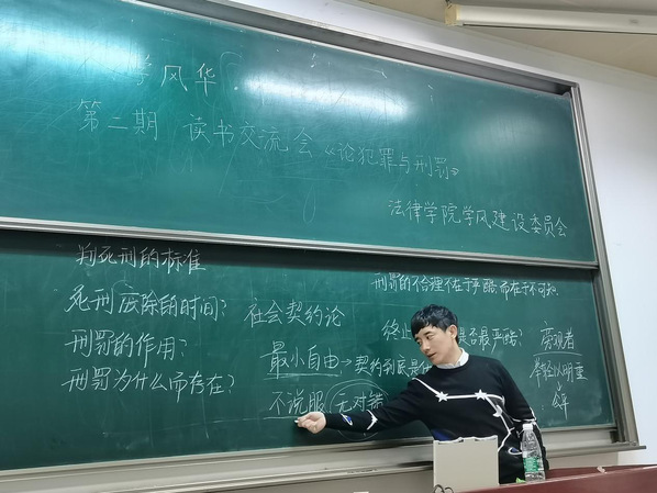 11月16日晚,由法律学院学风建设委员会举办的“尚学风华 书海拾贝”第二期读书交流会在主教304A举行。这次活动邀请到了法律学院王绍佳老师与来自各学院的五十余位同学一起交流阅读《论犯罪与刑罚》后的问题与思考。