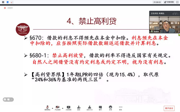 朱晓喆在讲座开始分析了《民法典》在格式条款、情势变更原则、金钱债权的可让与性、典型金融合同等的具体变化,阐述了《民法典》中有关合同的相关条文的变化给金融交易带来的有关影响。其次,朱教授就担保规则与金融担保的相关问题进行了讲解,包括《民法典》在动产抵押情形下登记对抗规则的发展与变化,其他担保物权的登记与优先顺位的变化,特殊的超级优先权等问题。然后,朱晓喆谈到担保物权呈现出了自由开放化的趋势,并分析了《民法典》在流抵、流质规则方面较之《物权法》的变化,以及《民法典》进一步放宽担保对象等问题。最后,朱晓喆强调《民法典》中的相关规定对于很多金融交易规则都有指导意义,对实践中的一些复杂的交易问题的处理,可以从《民法典》中寻找相关规则。
