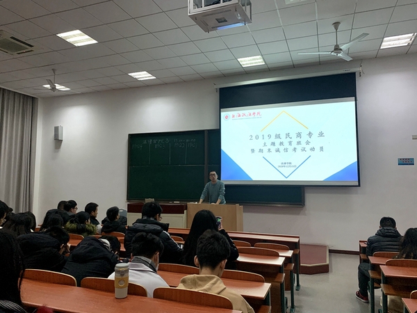12月15日晚,法律学院2019级民商专业主题教育班会暨期末诚信考试动员大会在法学楼B4-103教室召开。2019级民商专业全体学生参加本次主题教育班会。班会由2019级民商专业辅导员董敏维主持。