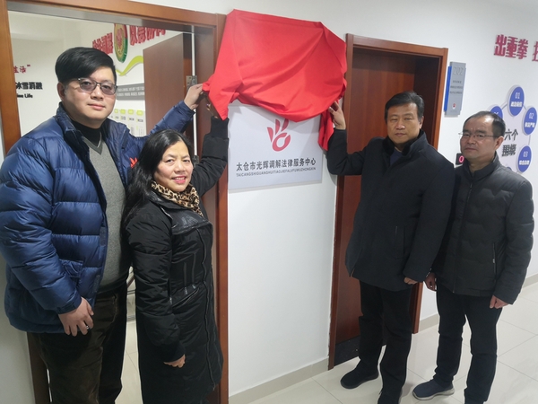 侯怀霞与顾潇军为太仓市光辉调解法律服务中心揭牌。