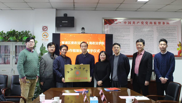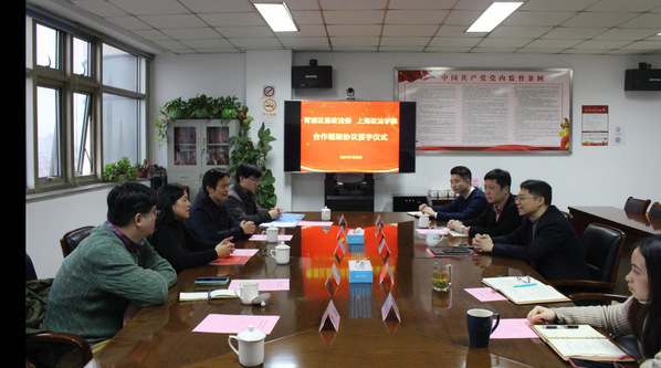 1月22日上午,为深入贯彻落实习近平法治思想和关于政法工作、人才培养系列指示精神,提高新时代政法工作现代化水平和卓越法治人才培养水平。法律学院院长侯怀霞一行5人赴青浦区政法委开展共建活动,并与青浦区政法委举行合作协议签约暨大学生实践教学基地揭牌仪式。法律学院院长侯怀霞、副院长王康、党总支副书记陆嵬、教师孙哲和学生李驰,青浦区政法委副书记曹秋龙、综治室主任黄国平、综治室副主任陈讯和工作人员张欢欢、赵军参加了本次活动。