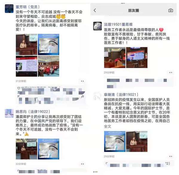 潘晨卿医生的援鄂经历分享,使在座师生深受感动引发了共鸣,纷纷在朋友圈表达了对抗疫战士们的敬意和感谢之情,他们是最美的逆行者,他们是中国的骄傲!谢谢他们用爱与坚守,与生命同行,向白衣天使们致敬!