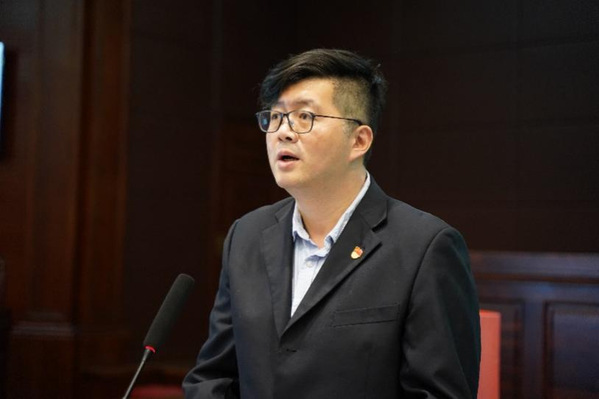 诸臻杰代表校学生会对本次大会的胜利召开表示祝贺,勉励全体学生坚定信念跟党走,将小我融入大我。