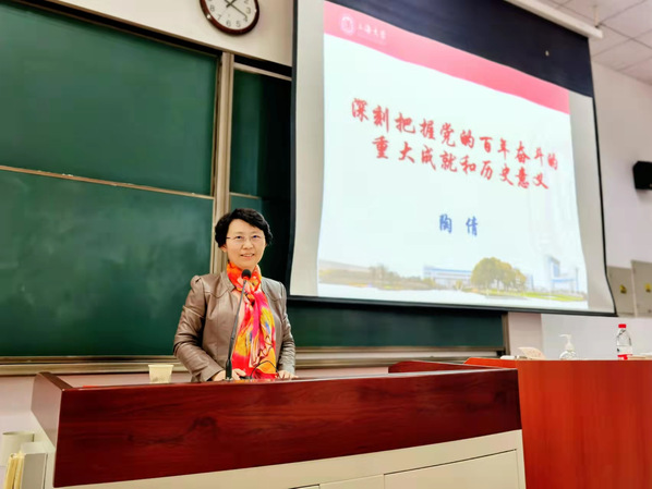 11月25日,上海大学马克思主义学院教授陶倩在B4-105进行题为《深刻把握党的百年奋斗的历史意义和重大成就》的第三讲。陶倩联系中共十九届六中全会阐述党的每届代表大会的相关知识与意义,从习近平新时代中国特色社会主义思想的指导地位的确立,中国生态环境保护所发生的历史性、转折性、全局性变化及推进和完善全方位多层次立体化的外交布局等多方面阐明如何把握党的百年奋斗的重大成就与历史意义,引导同学们更加深刻地认识到坚持中国共产党领导的重要意义。